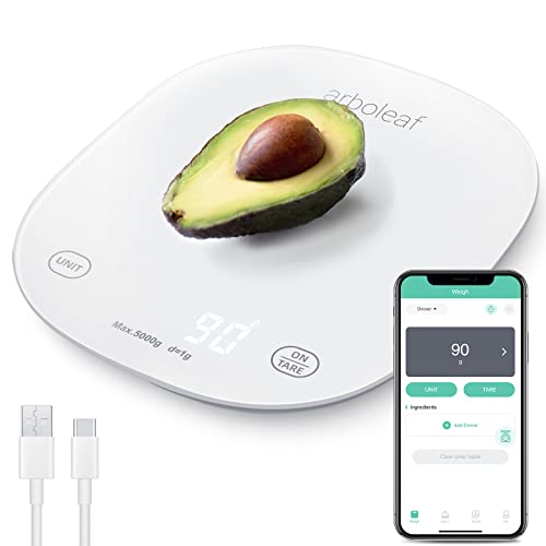 arboleaf Küchenwaage Digital, Küchenwaage USB Aufladbar, Waage Küchenwaage mit Kalorienzähler, Küchenwaage mit Bluetooth, 5kg/1g, Digitale Küchenwaage mit App, LED Display und Tara Funktion(Weiß)... [mehr lesen]